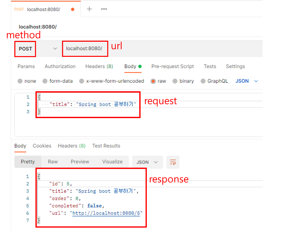 컨트롤러에서 전달받은 request의 요청을 파라미터로 받아서 model 클래스인 TodoEntity에 데이터를 넣는다. 그리고 리턴할 때 레파지토리에 데이터베이스 값을 save()로 insert 한다.