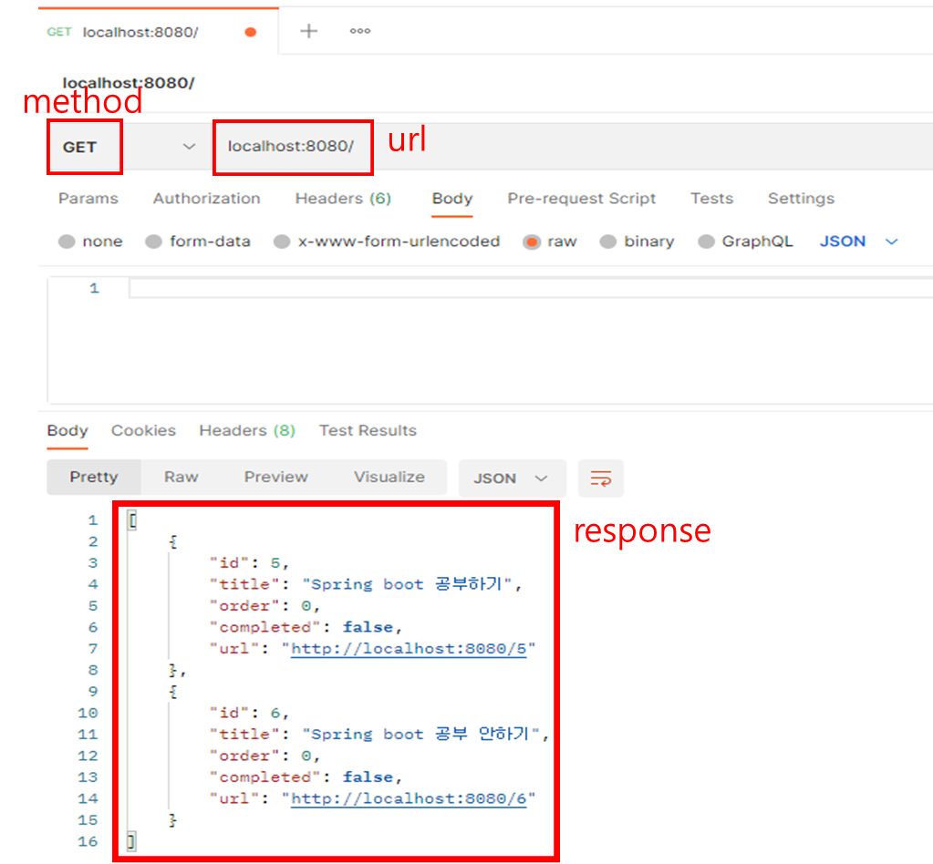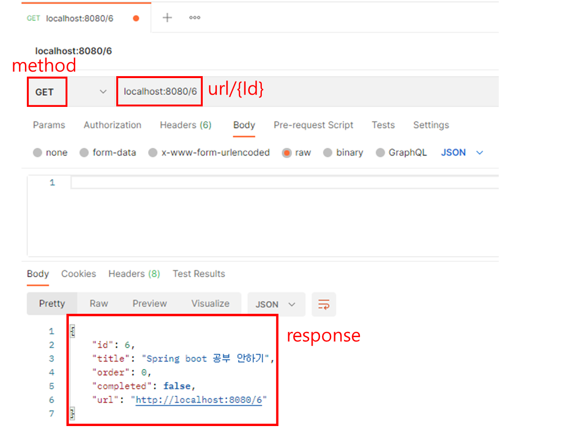 readOne() 메서드는 todolist에서 요청한 id값 경로로 하나씩 조회한다. @PathVariable을 사용하여 HTTP 요청에 대한 요청 url을 파라미터 형태로 사용할 수 있다. 쉽게 말하면 url endpoint에 @GetMapping에 명시한 {id}가 변수로 추가된다. @PathVariable을 사용하면 특정 resource id를 식별할 수 있다.