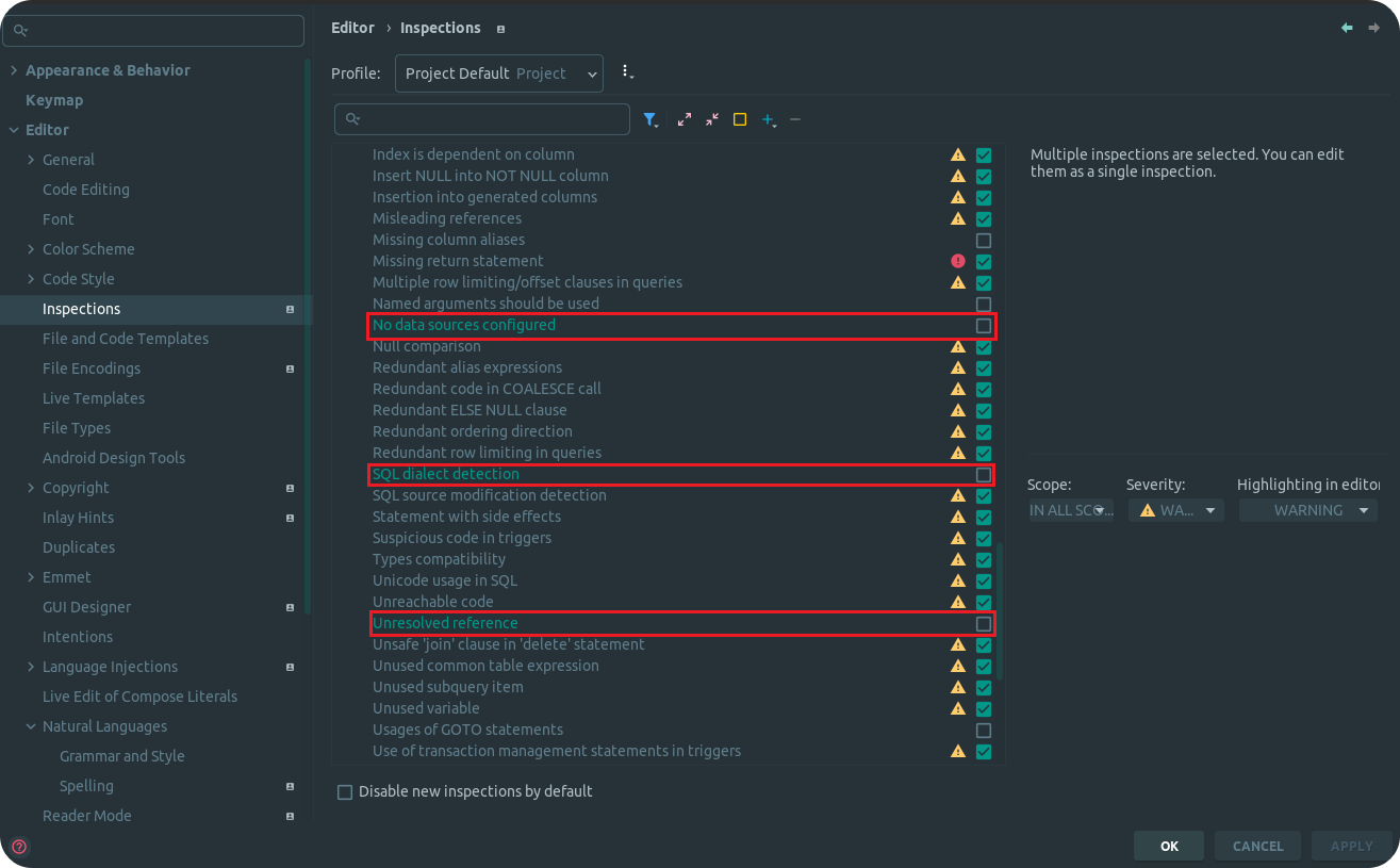 File > Setting > Editor > Inspections