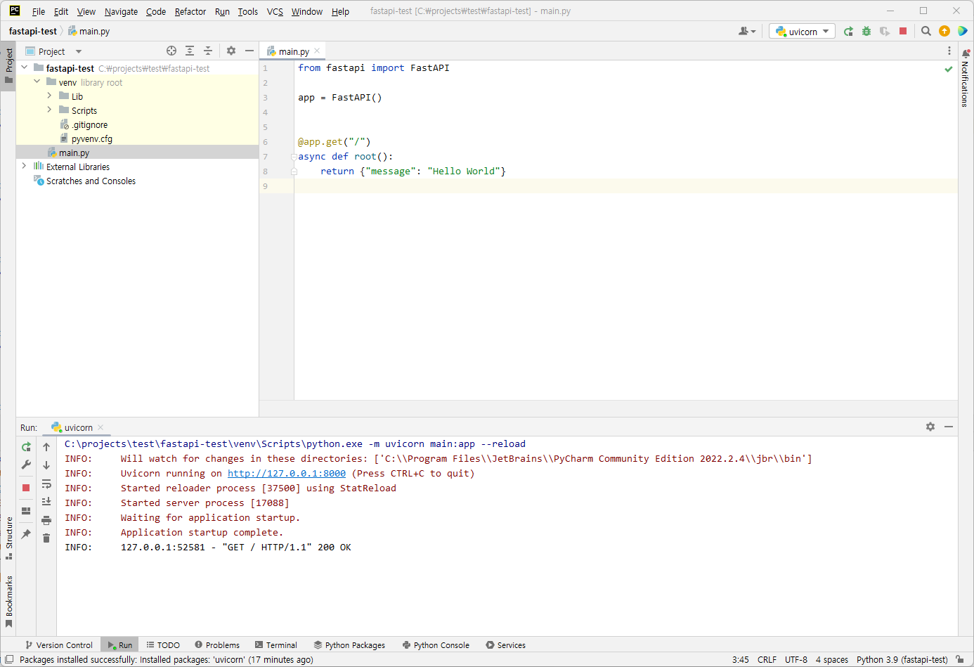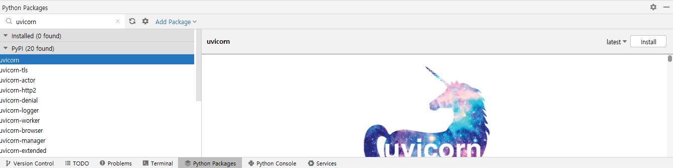 python packages 탭에서 fastapi와 uvicorn을 설치한다.
