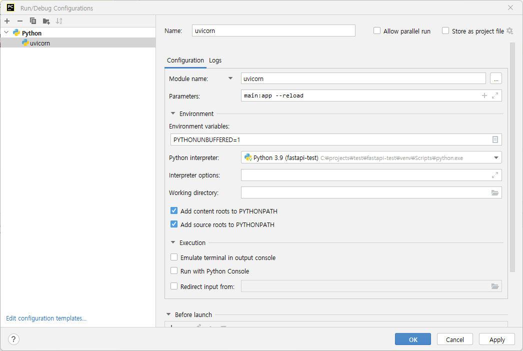 Module name에 uvicorn, Parameters에 main: app --reload 을 각각 기입하고 저장한다.
