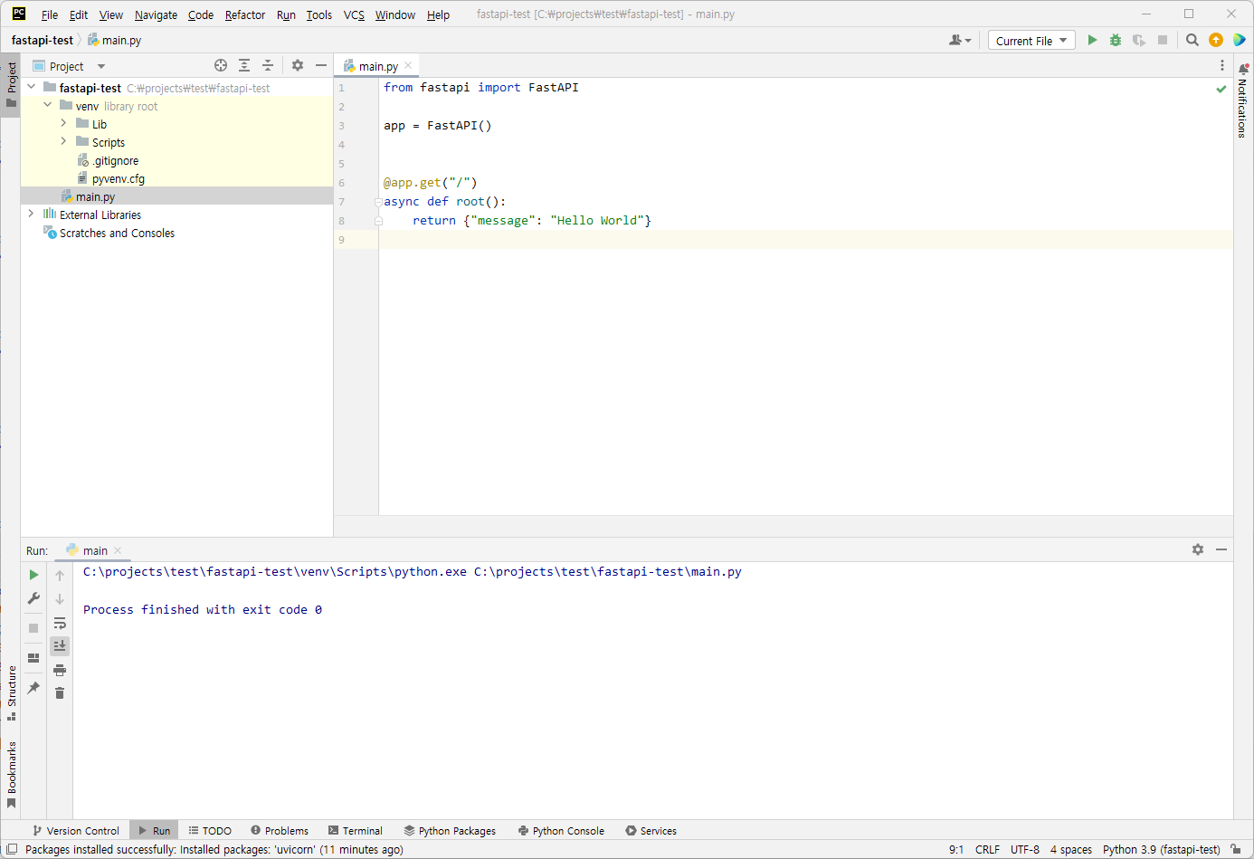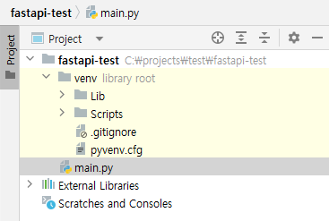 PyCharm Pro 버전에서는 FastAPI 관련 라이브러리 설치와 환경 설정이 자동 실행되어 프로젝트 생성이 수월하지만,