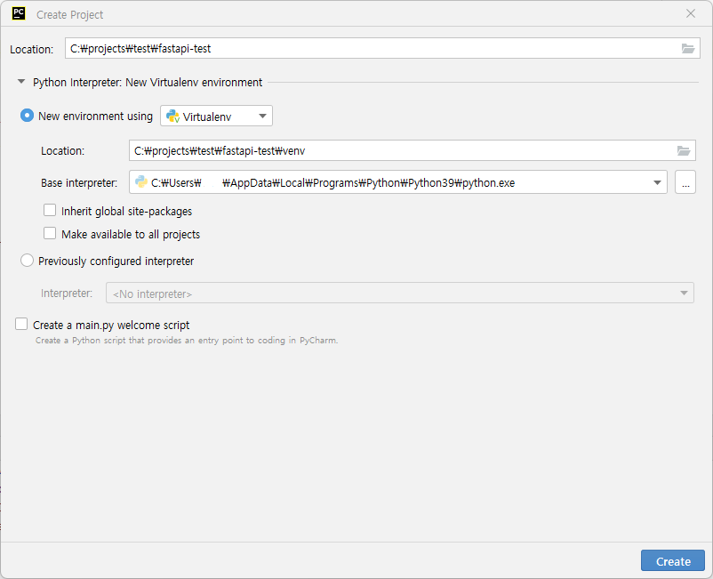 새 가상환경에서 프로젝트를 생성한다. (로컬에는 python 3.9이 설치되어 있어 3.9 버전을 기준으로 프로젝트를 생성했다)
