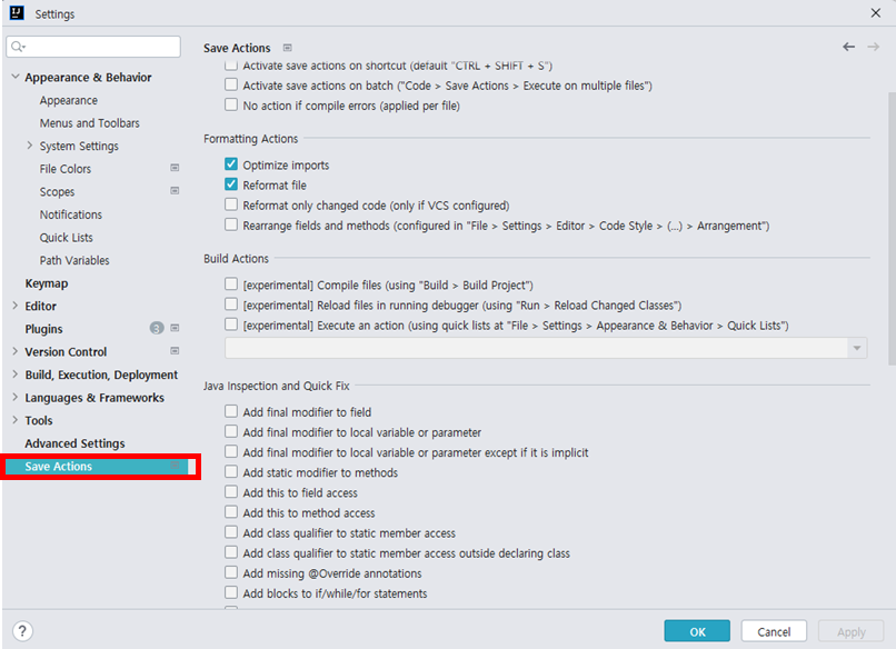 Active save actions on save (before saving each file, performs the configured actions below)을 체크 해준다.