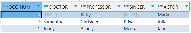 Pivot the Occupation column in OCCUPATIONS so that each Name is sorted alphabetically and displayed underneath its corresponding Occupation. The output column headers should be Doctor, Professor, Singer, and Actor, respectively.