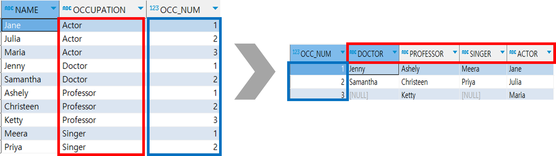 FOR Occupation(열로 만들 값이 모인 컬럼) IN ('Doctor' AS Doctor, 'Professor' AS Professor,'Singer' AS Singer,'Actor' AS Actor))