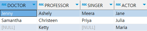 The empty cell data for columns with less than the maximum number of names per occupation (in this case, the Professor and Actor columns) are filled with NULL values.