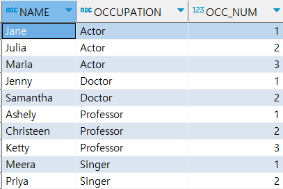 ROW_NUMBER() OVER (PARTITION BY Occupation ORDER BY Name) AS OCC_NUM
